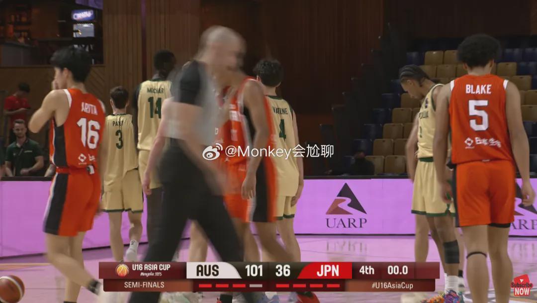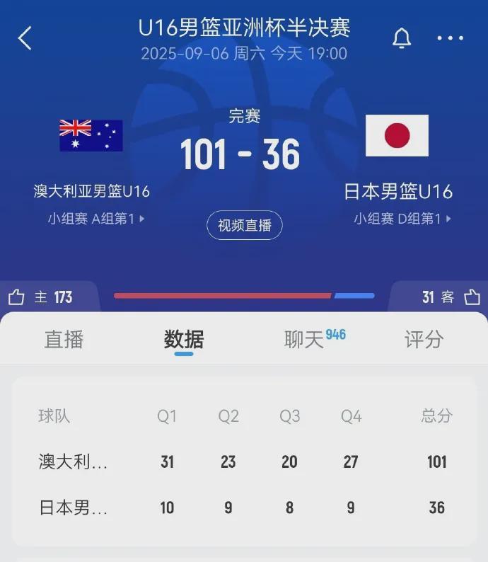 U16亚洲杯半决赛,澳大利亚101-36狂虐日本,赢了高达65分之多。