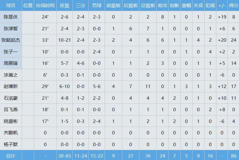 此役张懿赵杰大爆发,出手21次中10球,其中三分3中2,独揽24分6板6助1断1帽全面数据,正负值+20,得分和正负值均为全场最高,不愧是U16中国男篮的绝对核心,同年龄球员里面全国乃至亚洲范围内都是佼佼者。